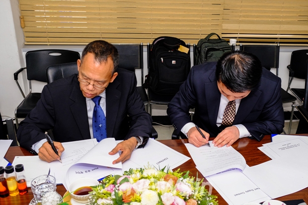 김강륜 대표(오른쪽)와 PT. VISI SUSANTARA KONEKTIVITAS사 'HAZAIRIN POHAN' 회장이 계약서에 서명하고 있다.