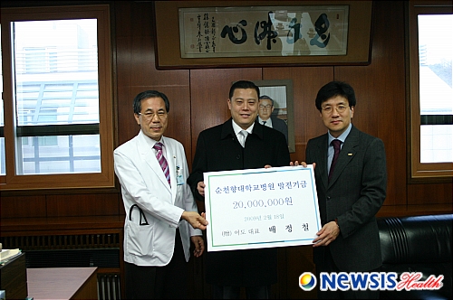 순천향대병원에 따르면 배 씨가 불우환자를 위해 써달라며 지난 2007년과 2008년에 이어 세 번째로 기부했으며 총 금액은 6000만 원이다.
