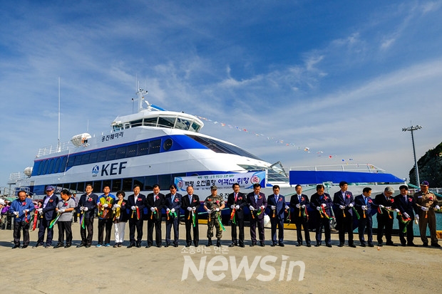 [뉴스인] 민경찬 기자 = 5일 오후 인천시 옹진군 백령면 용기포신항 부잔교에서 '백령 오전 출항 여객선 옹진훼미리 호 취항식'이 열려 조윤길 옹진군수(오른쪽 아홉 번째) 등 관계자들이 테이프를 커팅하고 있다.
