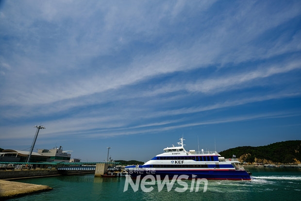 [뉴스인] 민경찬 기자 = 5일 오후 인천시 옹진군 백령면 용기포신항 부잔교에서 '백령 오전 출항 여객선 옹진훼미리 호 취항식'이 열려 행사에 앞서 '옹진훼미리 호'가 입항하고 있다.