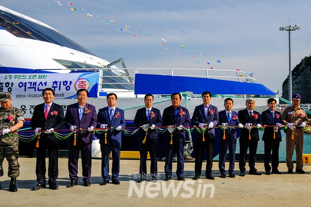 [뉴스인] 민경찬 기자 = 5일 오후 인천시 옹진군 백령면 용기포신항 부잔교에서 '백령 오전 출항 여객선 옹진훼미리 호 취항식'이 열려 김승남 고려고속훼리 대표 (오른쪽 세 번째) 등 관계자들이 테이프를 커팅하고 있다.