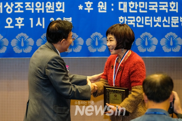 [뉴스인] 민경찬 기자 = '제4회 대한민국행복나눔봉사대상' 시상식이 23일 오후 국회의사당 국회헌정기념관 대강당에서 열려 가수 현숙(오른쪽)이 김덕룡 대회장으로부터 재능사회공헌상을 받고 있다.