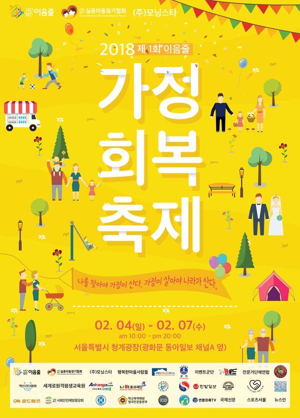 [뉴스인] 조진성 기자 = 사단법인 이음줄과 실종아동찾기협회는 오는 4일~7일 매일 오전 10시~오후 8시 청계광장(서울특별시 청계천 소라탑 앞)에서 제 1회 가정회복축제를 개최한다고 1일 밝혔다.