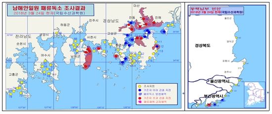해수부 국립수산과학원이 전국 해역의 패류독소를 조사한 결과 24일 기준 16개 지점에서 패류독소 기준치(0.8mg/kg)를 초과한 사실을 확인하고 각 지자체는 해당 해역에서의 패류채취를 금지하도록 했다.