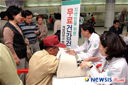 ▲ 계명대 동산병원은 지난 3일 시민들을 대상으로 무료 검진을 시행했다.<사진=계명대 동산병원 제공> 오현지기자 ohj@newsin.co.kr 【서울=뉴시스헬스】오현지 기자 = 계명대 동산병원은 대구 지하철 2호선 서문시장역에서 시민 건강상담 및 무료검진을 실시했다고 4일 밝혔다. 의사, 간호사, 임상병리사 등 의료진과 진료지원팀 10여 명으로 구성된 봉사단은 건강상담과 신체계측, 혈압, 비만, 혈당 검사 등을 100여 명의 지역민들에게 시행했다.