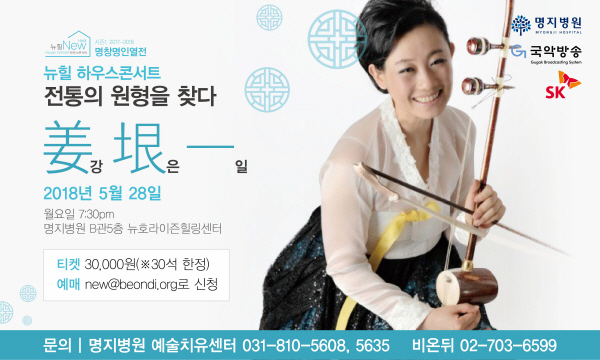 명지병원(병원장 김형수)은 오는 28일 오후 7시30분 뉴호라이즌힐링센터에서 한국 음악계에서 가장 개성적인 연주가로 꼽히는 해금 연주자 강은일 명인을 초청, 뉴힐하우스콘서트 일곱 번째 공연을 개최한다.