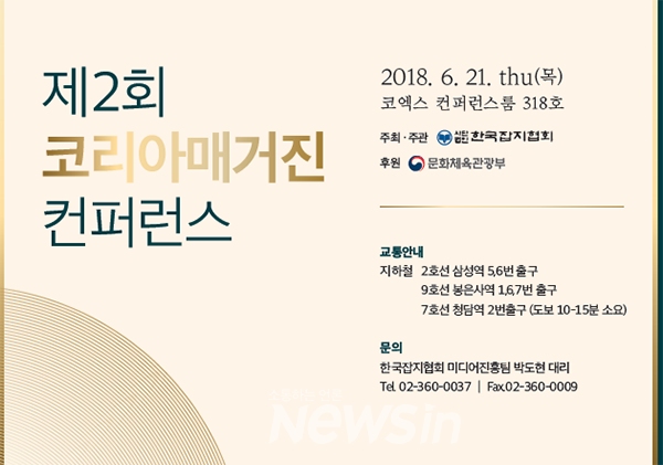 [뉴스인] 정경호 기자 = ‘제2회 코리아 매거진 컨퍼런스’가 21일 오전 코엑스 컨퍼런스 룸 318호 (사)한국잡지협회(회장 정광영) 주최로 ‘한국잡지의 해외진출 방안’과 ‘글로벌 잡지시장의 동향과 미래’ 대한 주제로 개최된다. 문의 : 한국잡지협회 미디어진흥팀 박도현 대리(02-360-0037)
