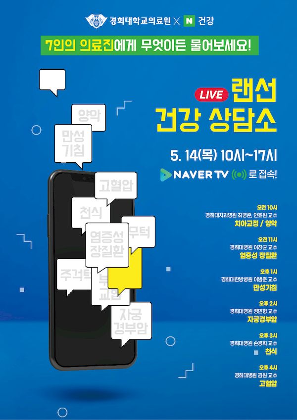 이번 '네이버 건강판 X 경희대의료원 랜선 건강상담'에서 다뤄질 주제는 ▲자궁경부암 예방 및 치료법(경희대병원 산부인과 정민형 교수) ▲염증성 장질환, 장 건강과 관리법(경희대병원 소화기내과 이창균 교수) ▲만성기침(경희대한방병원 폐장호흡내과 이범준 교수) ▲주걱턱·무턱, 부정교합 교정 및 수술치료(경희대치과병원 교정과 안효원 · 구강악안면외과 최병준 교수) ▲천식(경희대병원 호흡기알레르기내과 손경희 교수) ▲고혈압의 모든 것(경희대병원 심장혈관센터 김원 교수)이다.