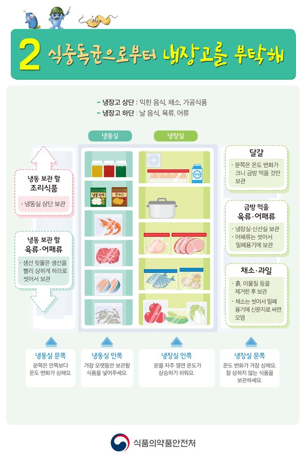 식품별 보관 방법에 따라 구입 후 바로 냉장 또는 냉동에 보관하고, 냉동 육류‧어패류 등은 온도 유지가 잘 되도록 냉동고 안쪽에 넣고 상하기 쉬운 식품은 냉장실 문 쪽에 보관하지 않도록 한다.