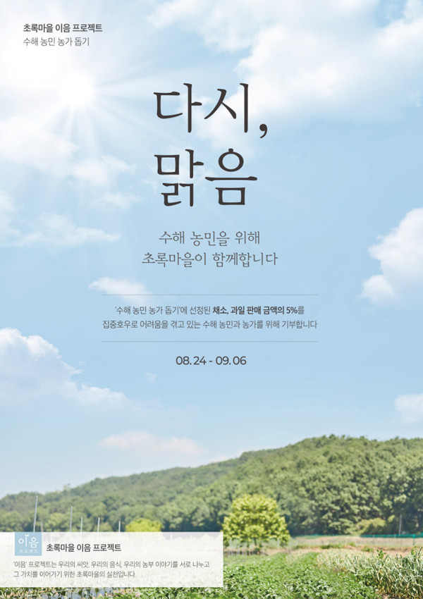 초록마을은 이음 프로젝트의 두 번째 이야기인 ‘다시 맑음’은 지난 여름 집중호우로 인하여 어려움을 겪는 농민, 농가에 도움을 주는 기부 프로젝트이다.
