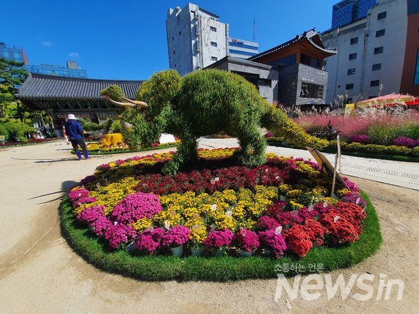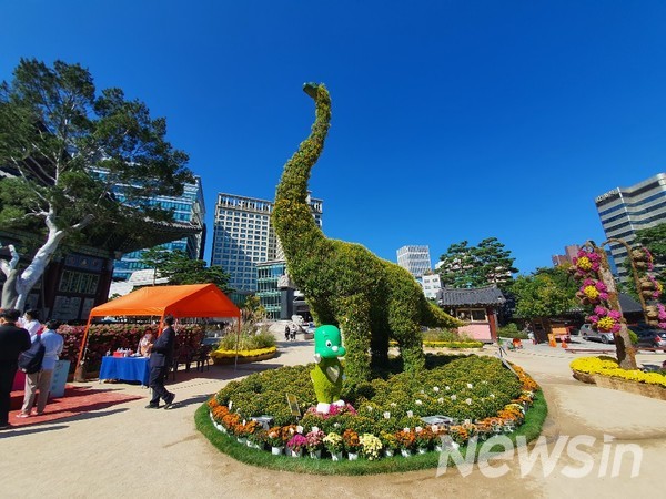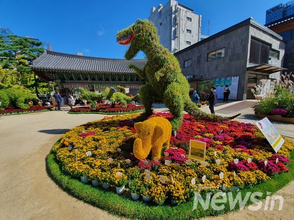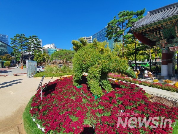 [뉴스인] 김태엽 기자 = 8일 서울 종로구 조계사에는 신종 코로나 바이러스감염증(코로나19)으로 인한 사회적 거리두기가 무색할 만큼 많은 시민들이 오후 낮 시간대를 활용해 조계사를 찾았다. 시민들은 마스크를 쓰고 거리 두기를 유지하며 따뜻한 가을볕을 즐기는 모습이었다. 공룡과 육바라밀을 결합한 ‘바라밀 다이노 파크’와 핑크뮬리 앞에서 사진을 찍는 시민들, 10일부터 있을 ‘시월국화는 시월에 핀다더라’를 주제로 제10회 ‘국화향기 나눔전’ 행사 준비를 위한 모습들을 볼 수 있었다.