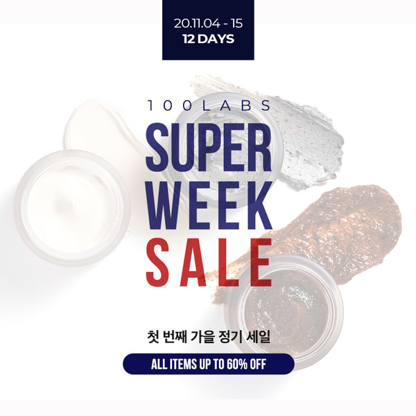 이번 슈퍼위크는 지난 9월 ‘100LABS’ 브랜드 론칭 이후 처음 진행하는 할인 행사로, ‘100LABS’의 다양한 뷰티케어 제품을 최대 60% 할인된 가격에 구입할 수 있다.