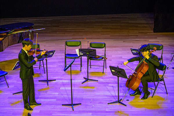 [뉴스인] 민경찬 기자 = 지난 5일 저녁 인천 복합문화공간 트라이보울에서 실내악단 i-신포니에타(단장 조화현)의 코로나19 위로 소통 콘서트 '그랬구나! 니편이 되어줄게"가 열려 바이올리니스트 정의철과 첼리스트 김상호가 피아졸라의 '망각'을 연주하고 있다.