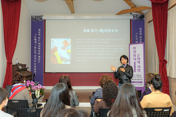 [뉴스인] 민경찬 기자 = 지난 13일 오후 인천 중국 대불호텔 기념관 전시실에서 전문직여성(BPW) 인천클럽(회장 정은섭)이 주최한 양성평등 특별 토크쇼가 열려 한국양성평등진흥원 변신원 교수가 강연하고 있다.
