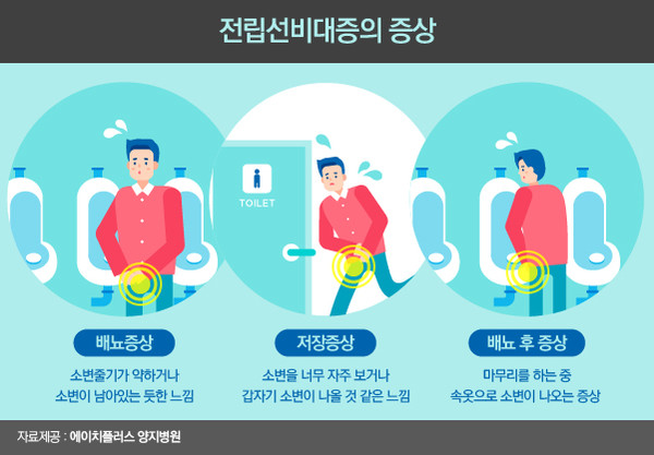 전립선비대증은 배뇨 증상, 저장 증상, 배뇨 후 증상 등 세 가지로 구분된다. 배뇨 증상은 말 그대로 소변이 시원하게 나오지 않는 증상으로 소변 줄기가 약하거나 방광에 소변이 남아있는 듯한 느낌이 드는 것을 말한다. 저장 증상은 소변을 잘 저장하지 못해 소변을 너무 자주 본 다거나 갑자기 소변이 빨리 나올 것 같은 증상이다. 배뇨 후 증상은 소변을 본 상태에서 마무리하는 중 속옷으로 소변이 쪼르륵 나와 버리는 상황으로 이런 현상들이 환자들을 가장 불편하게 하는 전립선비대증의 세 가지 증상이다.