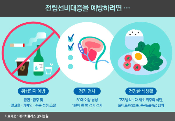 전립선비대증의 특별한 예방법은 따로 없다. 단, 금연과 금주, 식생활 개선 등으로 위험인자를 예방하는 자세가 필요하며, 50대 이상은 1년에 한 번 검사를 받는 것이 좋다. 라이코펜이라는 성분을 함유한 토마토와 식물 단백질이 풍부한 콩도 이소플라빈이라는 단백질이 전립선비대증을 억제하는 기능이 있는 것으로 알려져 있어 자주 섭취하는 것이 좋다. 식생활 습관은 고지방식보다는 채소 위주 식단이 질환 예방에 도움이 된다.