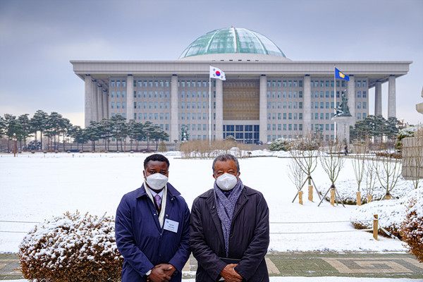 [뉴스인] 민경찬 기자 = 28일 오전 서울 국회의사당을 방문한 콩고민주공화국 국립의학연구소 소장 무옘베 탐품 박사(오른쪽)와 파라이 살루무 콩고 정부 변호사가 기념촬영을 하고 있다.