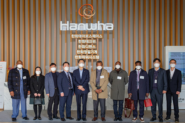 [뉴스인] 민경찬 기자 = 콩고민주공화국 국립의학연구소(INRB) 무옘베 탐품 박사(가운데 오른쪽)와 그 일행이 27일 오전 경기도 성남의 한화테크윈을 방문해 상담 후 안순홍 대표(가운데 왼쪽)와 기념촬영 하고 있다.