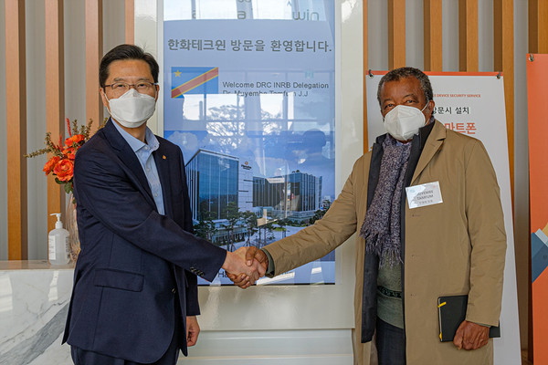 [뉴스인] 민경찬 기자 = 콩고민주공화국 국립의학연구소(INRB) 무옘베 탐품 박사(오른쪽)가 27일 오전 경기도 성남의 한화테크윈을 방문해 상담 후 안순홍 대표와 악수하고 있다.