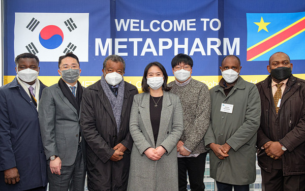 [뉴스인] 민경찬 기자 = 콩고민주공화국 국립의학연구소(INRB) 소장 무옘베 탐품 박사(왼쪽 세 번째) 일행이 28일 오후 서울 강남구 메타약품을 방문해 상담 후 이수진 대표(가운데)와 기념촬영 하고 있다.