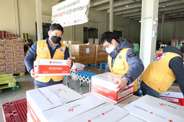 적십자사와 삼성은 지난 2일, 용인시 처인구 구호창고에서 설을 목전에 두고 ‘2021년 설맞이 4대 취약계층 및 사회복지시설 물품지원사업’지원물품의 포장작업을 실시하였다.