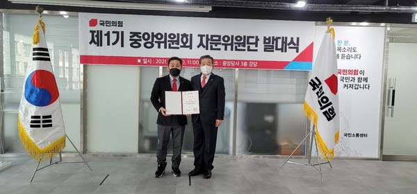 국민의힘 김종인 비상대책위원장으로부터 임명장을 받은 문화환경진흥중앙회 오정희 회장은 국민의힘 대구시당 홍보위원회 고문을 겸하고 있다.