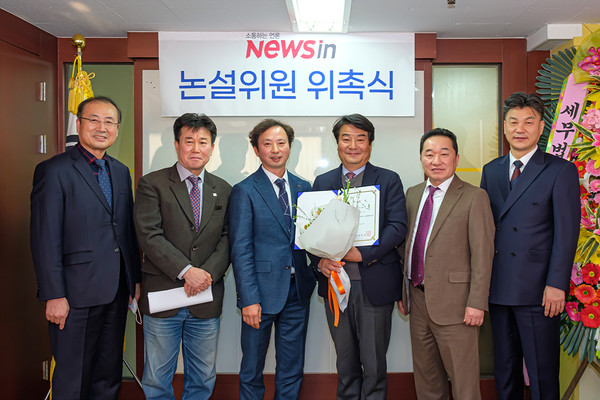 [뉴스인] 민경찬 기자 = 3일 오후 종로구 뉴스인미디어 회의실에서 전문위원 위촉 행사가 열려 최성호 다온 H&S 고문(오른쪽 세 번째)이 논설위원 위촉장을 받고 최명규 대표(왼쪽 세 번째) 등과 기념사진을 찍고 있다. 본 행사는 코로나19 방역 수칙을 지키며 진행됐으며 사진 촬영 시 잠깐 마스크를 벗기도 했다.