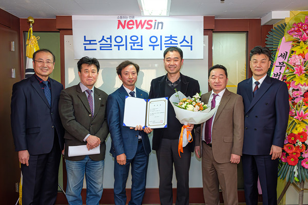 [뉴스인] 민경찬 기자 = 3일 오후 종로구 뉴스인미디어 회의실에서 전문위원 위촉 행사가 열려 구본철 JASPER 대표(오른쪽 세 번째)가 논설위원 위촉장을 받고 최명규 대표(왼쪽 세 번째) 등과 기념사진을 찍고 있다. 본 행사는 코로나19 방역 수칙을 지키며 진행됐으며 사진 촬영 시 잠깐 마스크를 벗기도 했다.