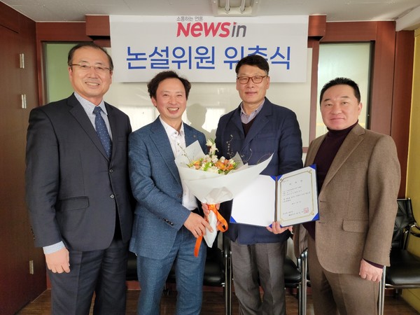 [뉴스인] 민경찬 기자 = 3일 오후 종로구 뉴스인미디어 회의실에서 전문위원 위촉 행사가 열려 이재근 전 신용보증기금 본부장(오른쪽 두 번째)이 논설위원 위촉장을 받고 최명규 대표(왼쪽 두 번째) 등과 기념촬영을 하고 있다. 본 행사는 코로나19 방역 수칙을 지키며 진행됐으며 사진 촬영 시 잠깐 마스크를 벗었다.