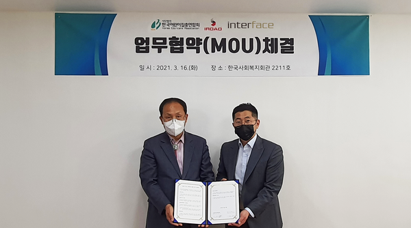 이날 협약식은 코로나19 예방 및 사회적 거리두기 지침을 지키기 위하여 (사)한국어린이집총연합회 이중규 회장과 (주)인터페이스 이명진 대표이사, 최성진이사 참석으로 최소한의 인원만 참석하였으며, (주)인터페이스에서와 함께 안전한 어린이 통학차량 운행을 위하여 상호 협력을 체결하였다.
