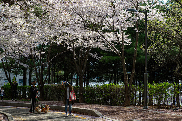 [뉴스인] 민경찬 기자 = 4일 오후 서울 강서구 방화동 근린공원에서 코로나19 확산 방지를 위해 마스크를 쓴 주민들이 벚꽃 산책로에서 반려견과 사진을 찍고 있다.