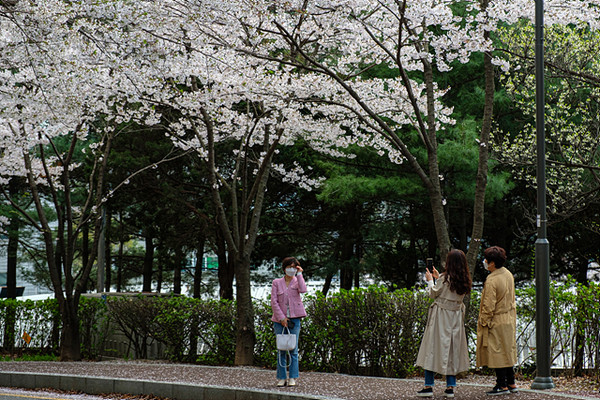 [뉴스인] 민경찬 기자 = 4일 오후 서울 강서구 방화동 근린공원에서 코로나19 확산 방지를 위해 마스크를 쓴 주민들이 벚꽃 산책로에서 기념사진을 찍고 있다.