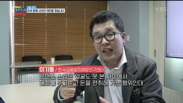 7일 KBS2 굿모닝 대한민국라이브에 출연한 이기동 소장은 "약 78명의 피해자들이 약 15억 여원이나 되는 엄청난 피해가 발생했고 대부분 피해자들이 여성들이었다"고 밝혔다.