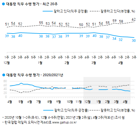 [뉴스인] 김태엽 기자=한국갤럽이 2021년 4월 셋째 주(13~15일) 전국 만 18세 이상 1,005명에게 문재인 대통령이 대통령으로서의 직무를 잘 수행하고 있다고 보는지 잘못 수행하고 있다고 보는지 물은 결과, 30%가 긍정 평가했고 62%는 부정 평가했으며 그 외는 의견을 유보했다(어느 쪽도 아님 4%, 모름/응답거절 5%).