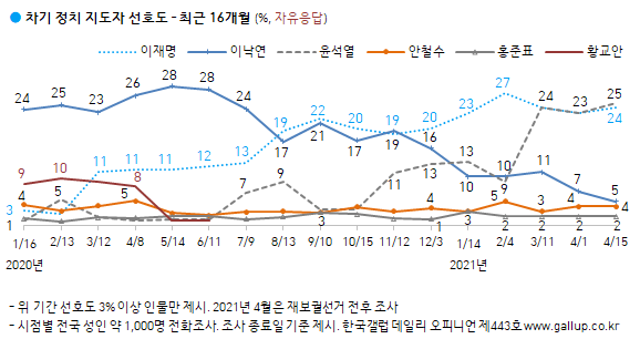 [뉴스인] 이현우 기자=한국갤럽이 2021년 4월 셋째 주(13~15일) 전국 만 18세 이상 1,005명에게 앞으로 우리나라를 이끌어갈 정치 지도자, 즉 다음번 대통령감으로 누가 좋다고 생각하는지 물은 결과(자유응답), 윤석열 전 검찰총장이 25%, 이재명 경기도지사가 24%로 재보궐선거전후 다름없이 선두 양강 구도를 이뤘다. 그다음은 이낙연 더불어민주당 전 대표(5%), 안철수 국민의당 대표(4%), 홍준표 무소속 의원, 오세훈 서울시장(이상 2%), 정세균 국무총리(1%) 순으로 나타났다. 4%는 그 외 인물(1.0% 미만 약 20명 포함), 33%는 특정인을 답하지 않았다.