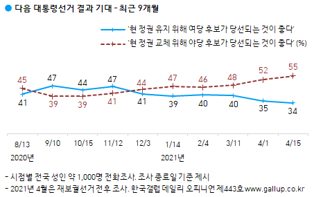 [뉴스인] 김태엽 기자=지방선거, 국회의원선거, 재보궐선거 결과는 현 정부에 대한 중간 평가 성격을 띠며, 대통령선거 결과는 정권 유지와 교체를 판가름한다. 현시점 유권자에게 내년 대통령선거 관련 두 주장 중 어느 쪽에 더 동의하는지 물은 결과 '현 정권 유지를 위해 여당 후보가 당선되는 것이 좋다' 34%, '현 정권 교체를 위해 야당 후보가 당선되는 것이 좋다' 55%로 나타났다. 12%는 의견을 유보했다. 작년 8월 이후 매월 조사에서 정권 유지론은 최소, 교체론은 최다로 차이가 커졌다.