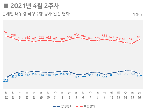 리얼미터가 YTN의뢰로 실시한 4월2주차(11일~16일) 주간 집계 결과, 문 대통령의 국정 수행 지지율은 전주 대비 1.3%포인트 오른 34.7%(매우 잘함 17.2%, 잘하는 편 17.5%)였다.