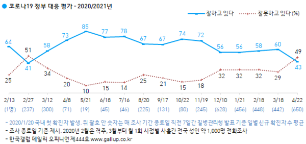 코로나19 정부 대응 긍정률은 일일 확진자 수가 한 자릿수까지 감소했던 작년 5월 초 85%에 달했다. 이후 점진 하락해 광화문 집회를 기점으로 수도권 확진자가 급증했던 8월부터 11월까지 70% 안팎에 머물다 3차 확산기에 접어든 12월 56%로 하락했다. 그때부터 전국 5인 이상 사적 모임 금지 등 고강도 거리두기가 이어졌고 백신 수급·안정성 논란도 있었지만, 그래도 방역 전반에 대해서는 지난달까지 긍정 평가가 우세했다.