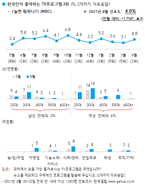 2021년 4월 한국인이 좋아하는 TV프로그램 2위: 〈놀면 뭐하니?〉(MBC) 4.8%