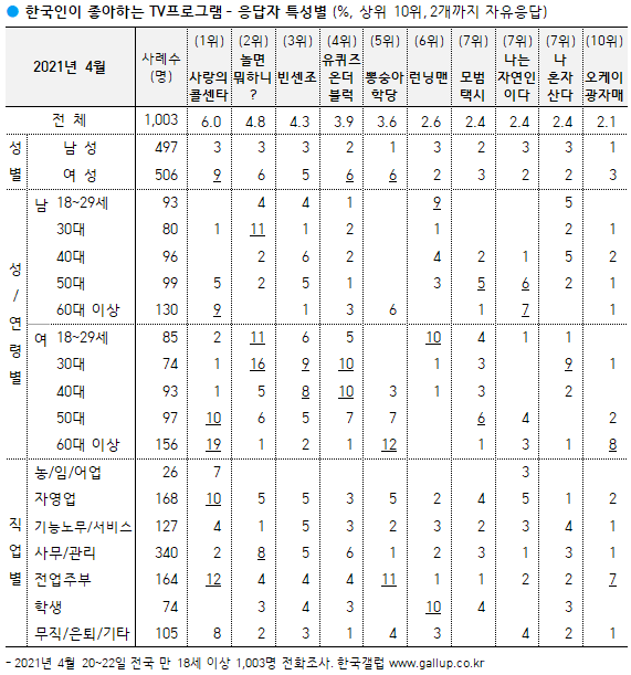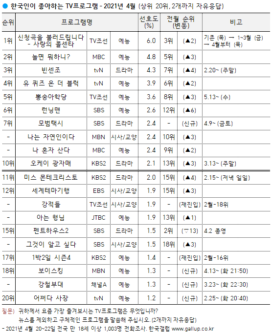 [뉴스인] 이현우 기자 =한국갤럽이 2021년 4월 20~22일 전국 만 18세 이상 1,003명에게 요즘 가장 즐겨보는 TV프로그램을 물은 결과(2개까지 자유응답), TV조선의 목요일 밤 예능 〈신청곡을 불러드립니다-사랑의 콜센타〉(이하 ‘사랑의 콜센타’)가 선호도 6.0%로 4개월 만에 다시 1위를 차지했다. 작년 4월 초 시작한 〈사랑의 콜센타〉는 동 시간대 전작 〈미스터트롯〉 결승에 진출한 트롯맨들이 전화로 신청받은 노래를 불러주는 프로그램이다.