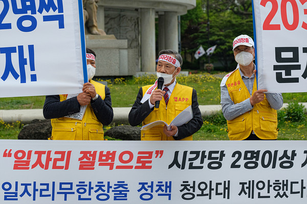 [뉴스인] 민경찬 기자 = 하이우분투 황비 서울센터장(가운데)이 27일 오후 청와대 분수대 앞에서 2030세대 일자리 창출과 관련해 기자회견을 하고 있다.