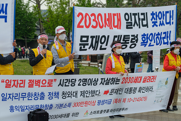 [뉴스인] 민경찬 기자 = 하이우분투 황비 서울센터장(왼쪽)이 27일 오후 청와대 분수대 앞에서 2030세대 일자리 창출과 관련해 기자회견을 하고 있다.