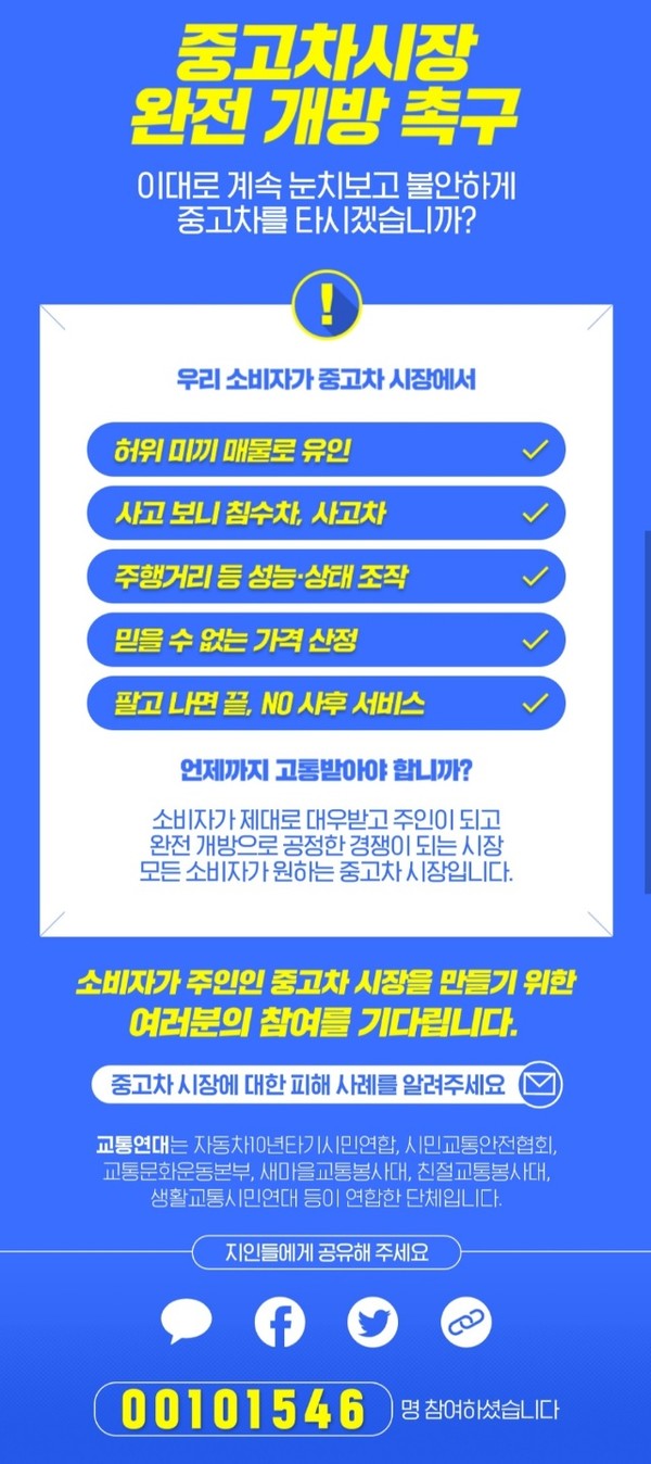 자동차시민연합 임기상 대표는 “한 달도 안 돼 10만 명이 넘는 소비자가 서명에 참여한 것은 중고차 시장의 변화를 바라는불만의 표출”이며 “정부는 더이상 중고차 시장의 혼란과 소비자 피해 방지 차원에서 조속한 결정을 촉구”했다. 이번 온라인 서명에 참여한 교통연대는 혼탁한 중고차 시장을 개선과 중고차 시장 전면 개방을 위해 자동차시민연합을 비롯한 민교통안전협회, 교통문화운동본부, 새마을교통 봉사대, 친절교통봉사대, 생활교통시민연대 등 6개 교통·자동차 전문시민단체가 주도하고 있다.