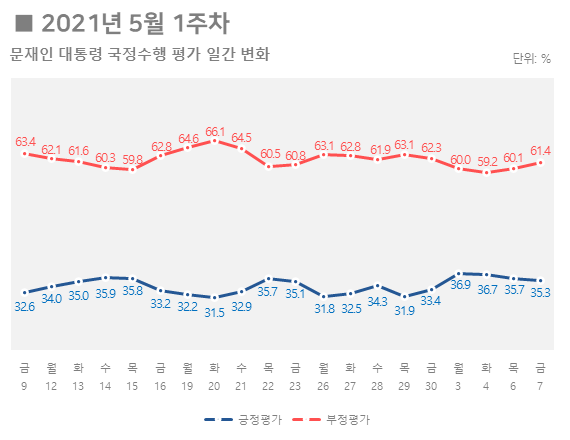 긍정 평가와 부정 평가 간 차이는 24.3%P로 오차범위 밖이다. 대통령 지지율 일간 지표는 지난주 금요일(4월 30일) 33.4%(부정 평가 62.3%)로 마감한 후 3일(월)에는 36.9%(3.5%P↑, 부정평가 60.0%), 4일(화)에는 36.7%(0.2%P↓, 부정 평가 59.2%), 6일(목)에는 35.7%(1.0%P↓, 부정 평가 60.1%), 7일(금)에는 35.3%(0.4%P↓, 부정 평가 61.4%) 지지율 흐름을 보였다.