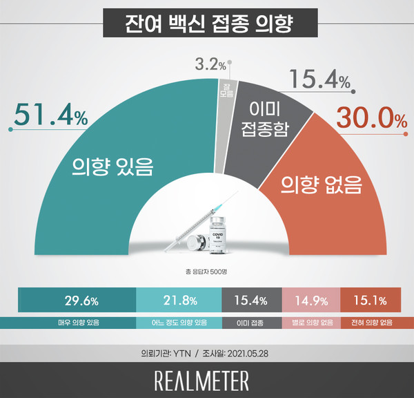 최근 전국 코로나19 접종 위탁 의료기관 중 잔여 백신이 발생한 곳에서 당일 접종이 가능한 가운데, YTN <더뉴스> 의뢰로 여론조사 전문기관 리얼미터(대표 이택수)가 잔여 백신 접종 의향 여부를 조사했다.