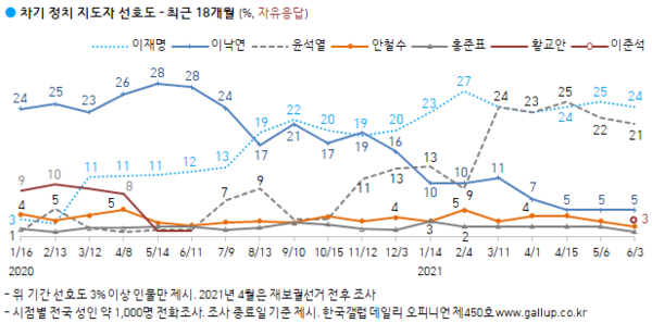 [뉴스인] 이현우 기자 =한국갤럽이 2021년 6월 첫째 주(1~3일) 전국 만 18세 이상 1,003명에게 앞으로 우리나라를 이끌어갈 정치 지도자, 즉 다음번 대통령감으로 누가 좋다고 생각하는지 물은 결과(자유응답), 이재명 경기도지사가 24%, 윤석열 전 검찰총장이 21%로 선두 양강 구도가 4개월째 이어졌다. 그다음은 이낙연 더불어민주당 전 대표(5%), 이준석 국민의힘 전 최고위원(3%), 안철수 국민의당 대표(2%), 정세균 전 국무총리, 홍준표 무소속 의원(이상 1%) 순으로 나타났다. 6%는 그 외 인물(1.0% 미만 약 20명 포함), 36%는 특정인을 답하지 않았다.