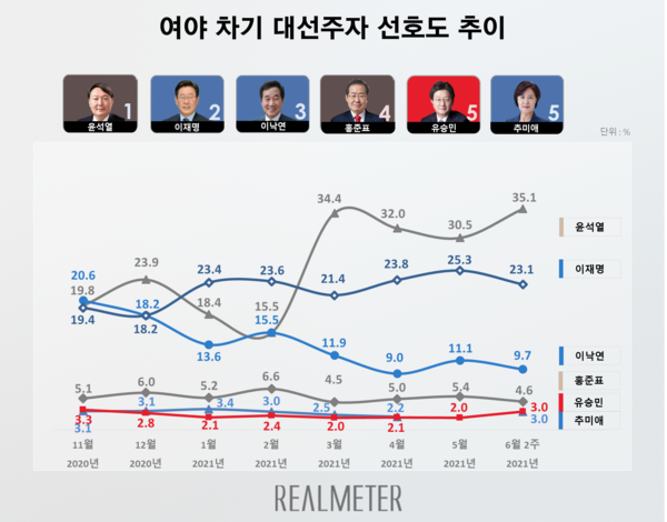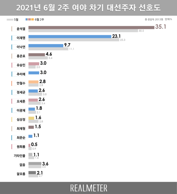 [뉴스인] 김태엽 기자=여론조사 전문기관 리얼미터(대표 이택수)가 <오마이뉴스> 의뢰로 여야 주요 정치인 14인을 대상으로 한 2021년 6월 2주 차기 대선주자 선호도 조사<매월 한차례 마지막 주에 조사했던 차기 대선주자 선호도가 이번 조사부터 매월 격주(2·4주)로 두차례 실시>를 실시한 결과, 윤석열 전 검찰청장이 2주 전 5월 조사 대비 4.6%포인트 상승한 35.1%를 기록, 30%중반대로 올라서며 1위를 이어갔다. 2위와의 차이는 오차범위(±2.2%P) 밖으로 5.2%포인트(지난 5월 조사)에서 12.0%포인트로 벌어졌다.