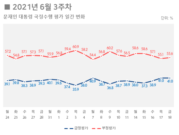 [뉴스인] 김태엽 기자=여론조사 전문기관 리얼미터(대표 이택수)가 YTN 의뢰로 6월 14일(월)부터 18일(금)까지 닷새 동안 전국 18세 이상 유권자 49,916명에게 통화를 시도해 최종 2,514명(무선 90 : 유선 10)이 응답을 완료한 2021년 6월 3주차 주간집계 결과, 문재인 대통령 취임 215주차 국정 수행 지지도(긍정 평가)가 지난주 6월 2주차 주간집계 대비 1.1%P 높아진 39.6%(매우 잘함 23.1%, 잘하는 편 16.5%)로 나타났다.
