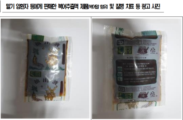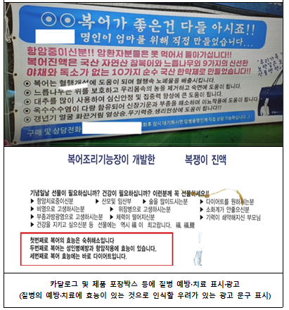 울산 동구 소재의 식품제조가공업체인 ㈜해국식품은 19년 4월부터 21년 3월까지 인터넷 쇼핑몰과 전단지에 병후 기력회복, 항암치료 전·후 원기충전, 항암예방, 비염, 위장병 등 질병 치료에 효과가 있는 것처럼 허위로 광고해 복어추출액 2개 제품 약 153kg(약 1,328만원)을 판매했다.