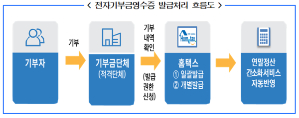 [뉴스인] 김기현 기자 = 국세청(청장 김대지)은 기부문화 활성화 지원을 위해 1일부터 '전자기부금영수증' 제도를 시행한다.